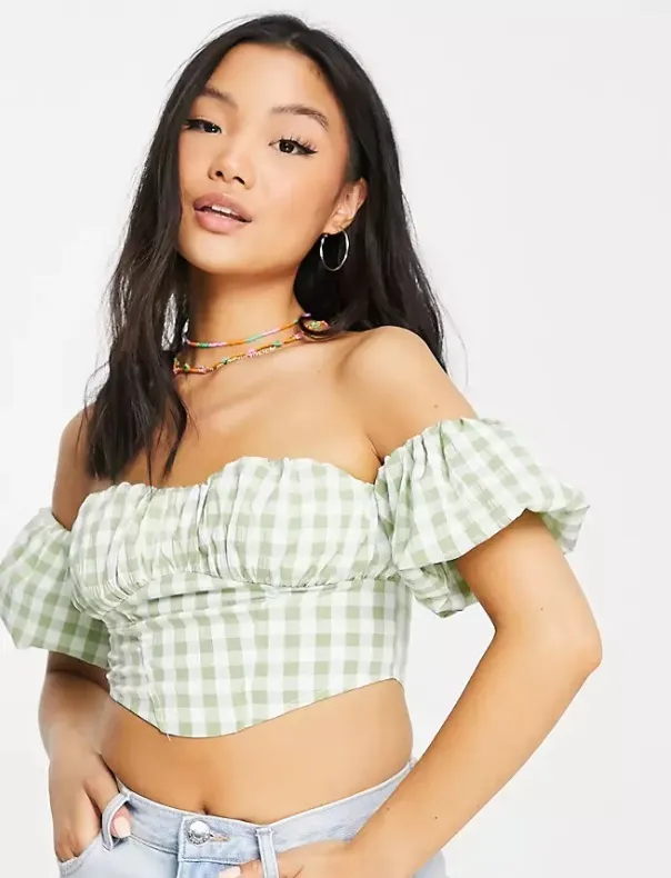 Для романтичных образов выбирай топ со сборками и рукавами-фонариками с мелким цветочным паттерном. К нему идеально подойдет мини-юбка по фигуре или светлые шорты в винтажном стиле.