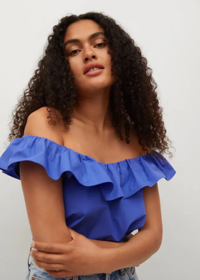 Топ насыщенного синего цвета с воланом стильно смотрится с любым низом, будь то базовые джинсы, юбка в цветочек или шорты-бермуды.