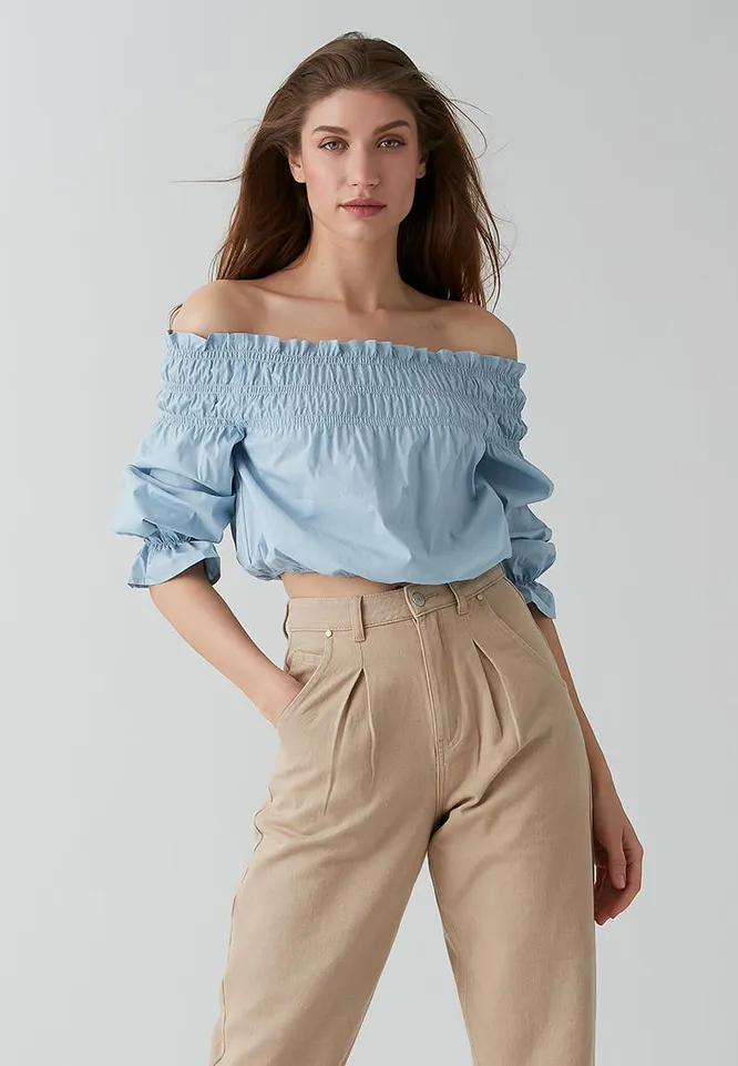 Акцент на шею и изящные ключицы — 9 модных топов со спущенными плечами