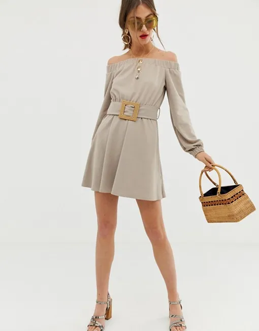 Платье бежевого цвета с широким поясом на талии точно станет твоим любимчиком этим летом. Ты сможешь надеть его в офис с остроносыми лодочками оттенка нюд и маленькой строгой сумочкой или на модную вечеринку с дерзкими босоножками на тонких ремешках и контрастным клатчем.