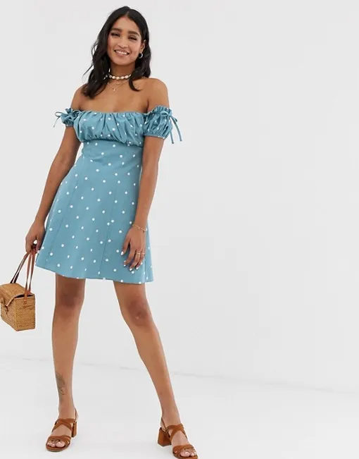 Мини-сарафан голубого цвета в мелкий горошек оценят нежные натуры и истинные романтики. Такую модель можно надеть на свидание, летний фестиваль или девичник. Идеальное дополнение к образу – босоножки на квадратном каблуке и модная сумочка из соломки.