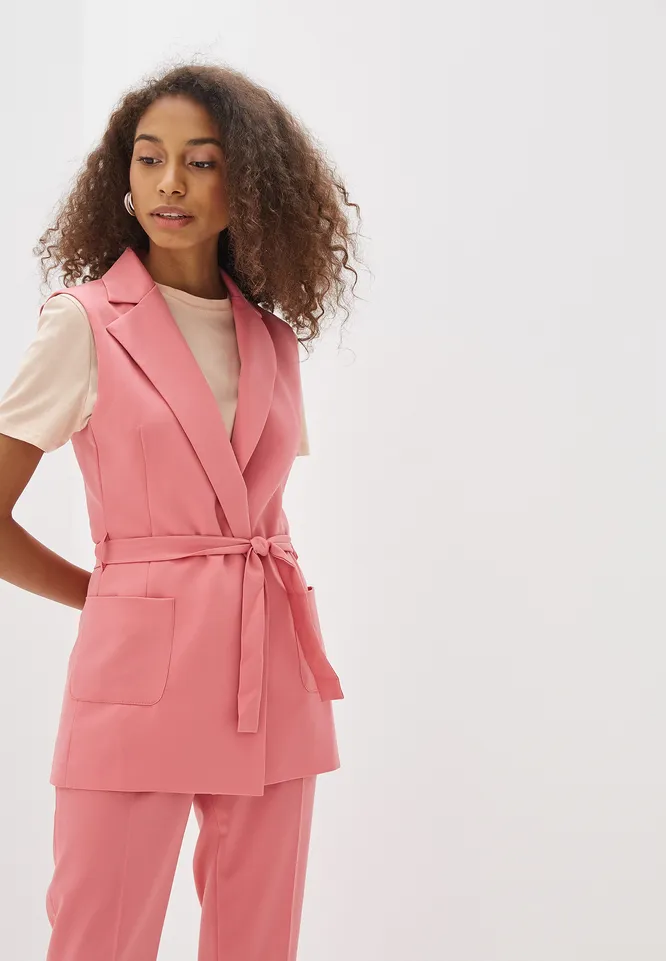 Розовый жилет с коралловым подтоном будет круто смотреться в составе монохромных луков, а также в тандеме с белыми вещами.