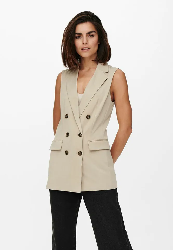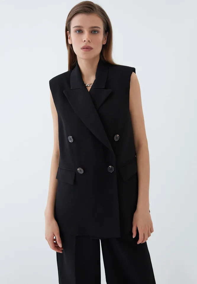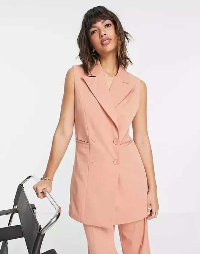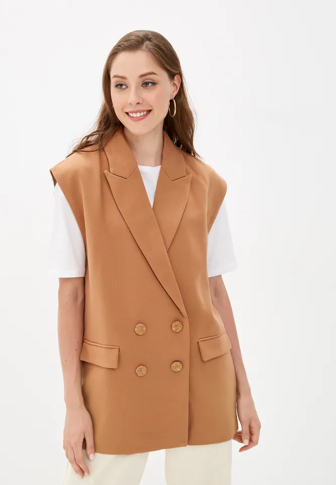 Тем, кто предпочитает классику, стоит обратить внимание на бежевый двубортный жилет. Носи его на голое тело с брюками-сигаретами или используй как верхний слой и сочетай с футболками, кроп-топами, шортами или короткими юбками.