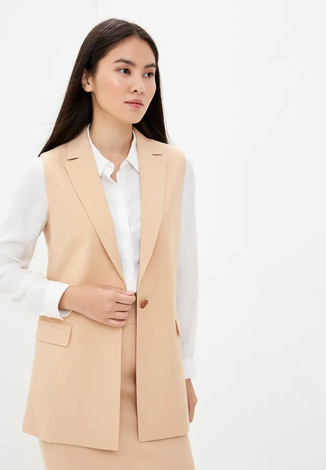 Для создания элегантного образа выбирай строгий бежевый жилет прямого кроя. Летом можно носить его поверх льняной рубашки с коротким рукавом, дополняя удлиненными шортами.