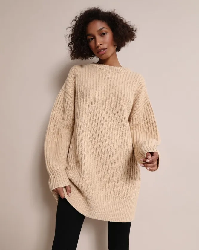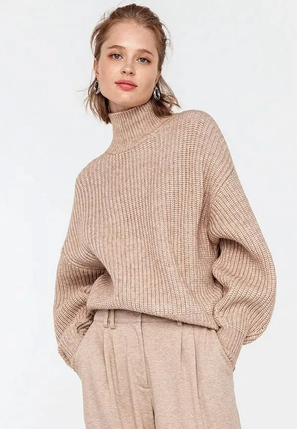 Если тебе давно не хватало базовой вязаной кофты, присмотрись к объемному бежевому свитеру. Свободный крой и нейтральная расцветка — основные характеристики универсальной вещи.