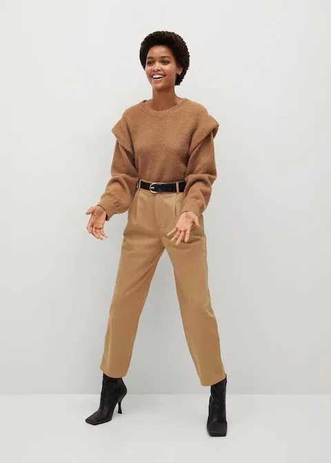 Смело внедряй в офисный аутфит немного футуристичную кофту с объемным рукавом. Трендовая вещь быстро «подружится» с широкими деловыми брюками, ботинками с квадратным носком и объемной дубленкой светлых оттенков. Из аксессуаров — объемная сумка-мешок и кожаный ремень на талию.