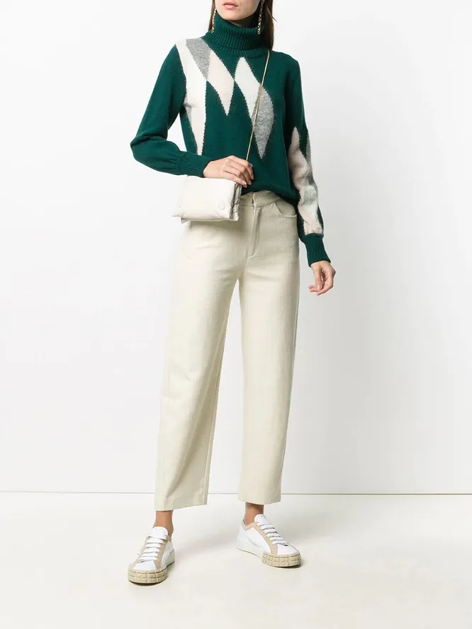 Зеленая кофта с высоким горлом украшена трендовым аргайлом. Но здесь традиционный принт немного переосмыслен, и уже не смотрится так привычно и знакомо.
