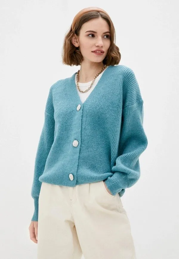 Пастельный голубой кардиган станет идеальным дополнением к твоему базовому гардеробу. Носи трендовую кофту на пуговицах с бланковой светлой футболкой и повседневными джинсами.