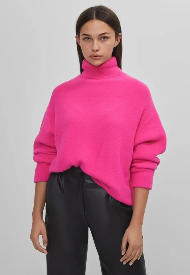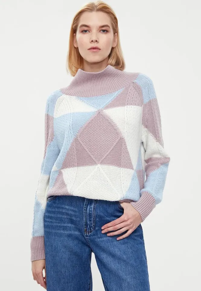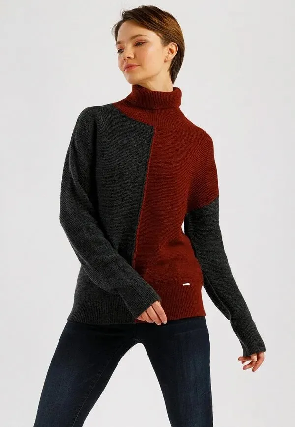 Хочешь примерить яркий тренд, но боишься перегрузить наряд цветом? Делай ставку на приглушенную расцветку колор-блок. Базовая кофта с высоким горлом удачно впишется в повседневные расслабленные ансамбли.
