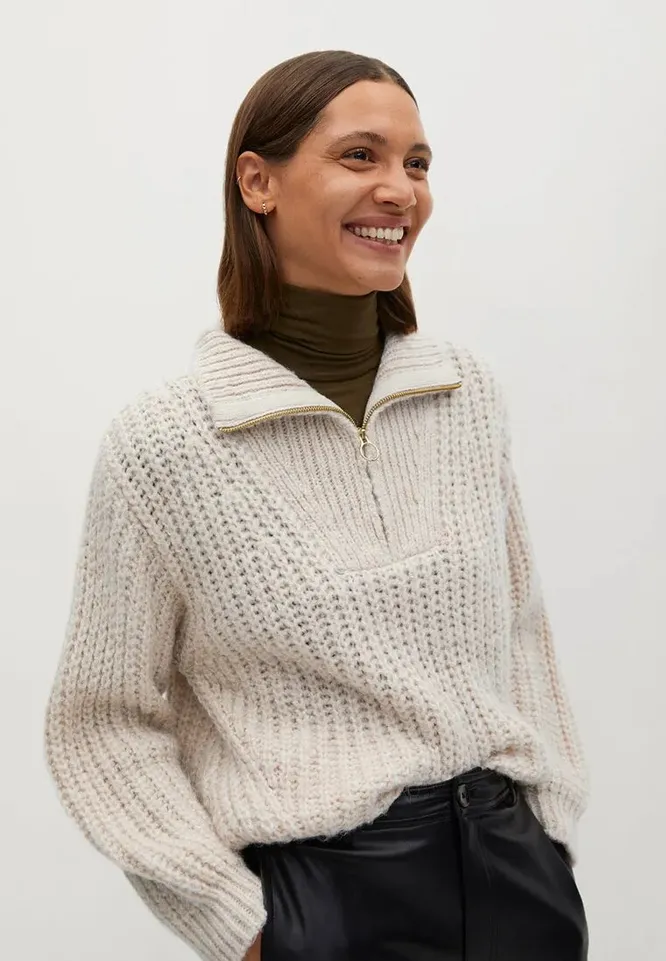 Стильная спортивная кофта с высоким воротником на молнии теперь может стать частью не только горнолыжного, но и повседневного аутфита. Миксуй джемперы из мягкой пряжи с контрастными по цвету водолазками и кожаными брюками.