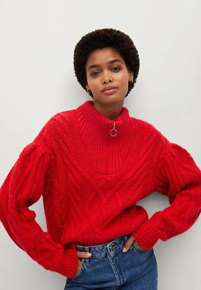 Ярко-красная кофта с воротником на молнии сможет оперативно заменить бежевый, белый и черный свитер в повседневном образе.