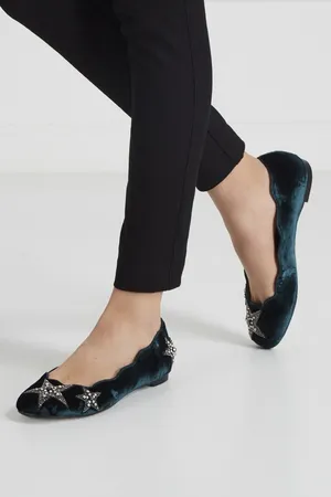 Балетки способны заменить «лодочки» и в вечернем выходе — бархатные балетки с блестящими звездами гармонично впишутся в образ с маленьким черным платьем.