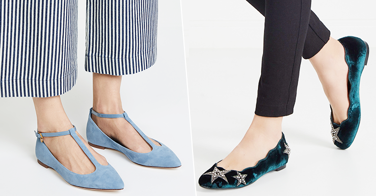 Балетки способны заменить «лодочки» и в вечернем выходе — бархатные балетки с блестящими звездами гармонично впишутся в образ с маленьким черным платьем.