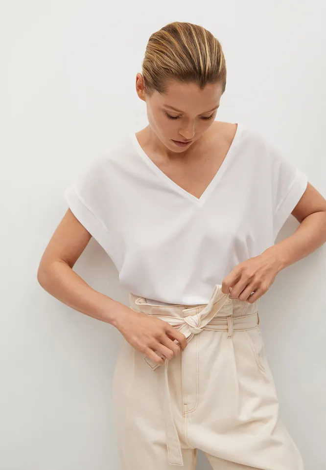 Что касается фасонов, то всегда актуальны классические футболки с рукавом и круглым вырезом. А если хочешь подчеркнуть шею и зону декольте, то выбирай модели с глубоким V-образным вырезом.