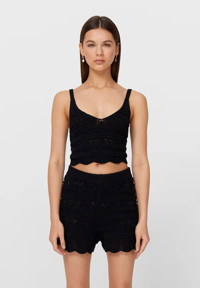 Мастхэв сезона — вязаный кроп-топ. Отличная основа под пиджаки и рубашки. Советуем носить его с юбками, шортами, брюками, джинсами с высокой посадкой.