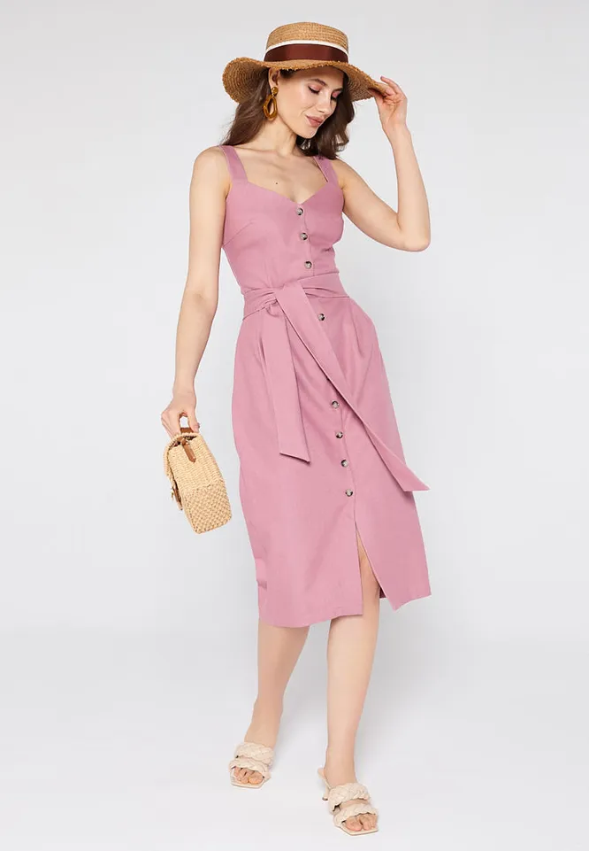 Универсальный наряд на каждый день — платье-рубашка. Мы выбрали модель актуального сиреневого цвета из 100% льна.