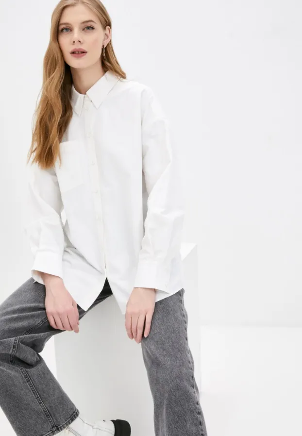 Весной стоит отдать предпочтение рубашкам свободного кроя. Это могут быть и с длинным рукавом, и с коротким. Плотная белая оверсайз-рубашка отлично подойдет для создания многослойных луков: ее можно надеть поверх водолазки, футболки, джемпера и дополнить объемным пиджаком или кардиганом. Модель с коротким рукавом предлагаем дополнять брюками и джинсами с высокой посадкой, отличный вариант – добавить вязаный жилет.