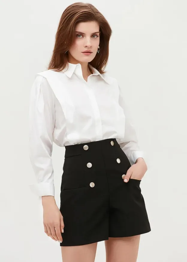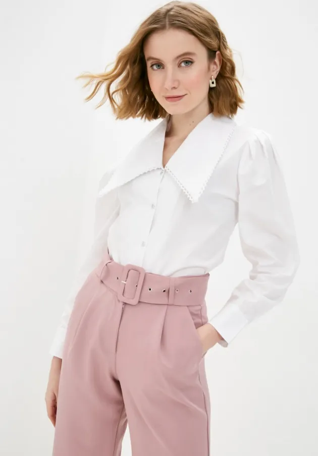 Для деловых образов выбирай рубашку прямого кроя с классическим отложным воротником – идеальная основа для строгих брючных костюмов, сарафанов, юбок по фигуре.