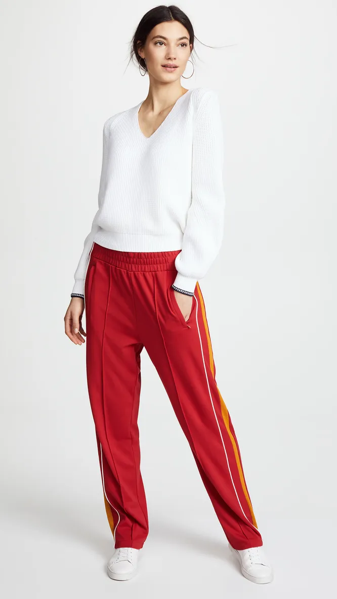 Спорт-шик продолжает оставаться в топе модных тенденций, поэтому, если тебе близок этот стиль, обрати внимание на спортивные брюки красного цвета с лампасами.