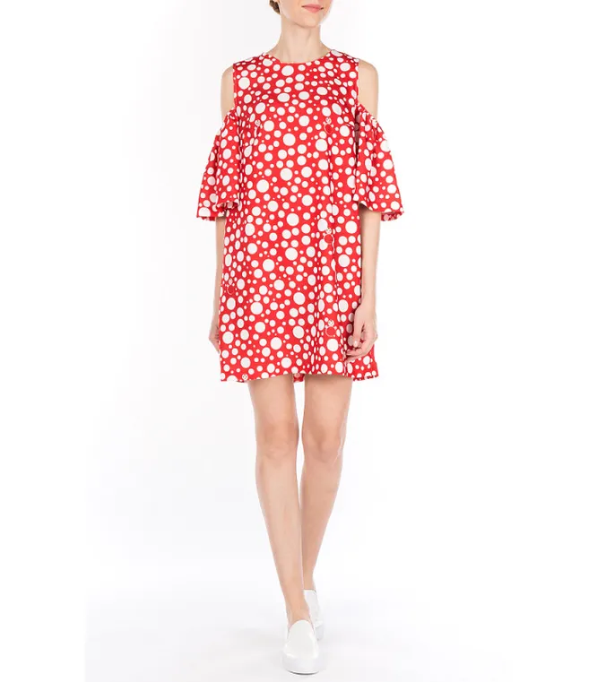 Если тебе ближе принты, нежели «тотальный» красный, присмотрись к легкомысленному горошку (здесь воланы также будут вполне уместны).