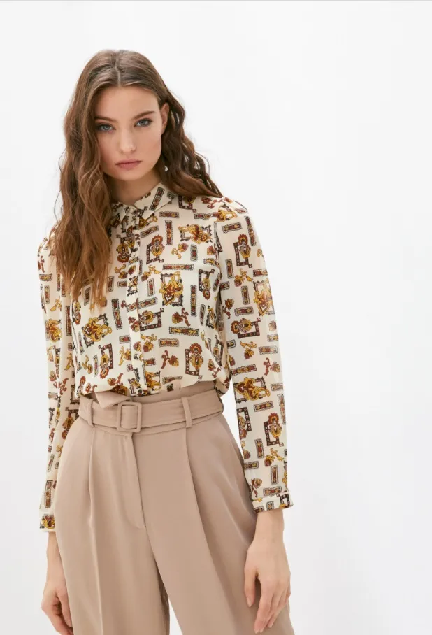 Цепочный принт негромко, но всё же вернулся в моду. Обрати внимание на лаконичную бежевую блузу. Предлагаем носить ее с широкими коричневыми брюками, а поверх можно накинуть однотонный жакет.