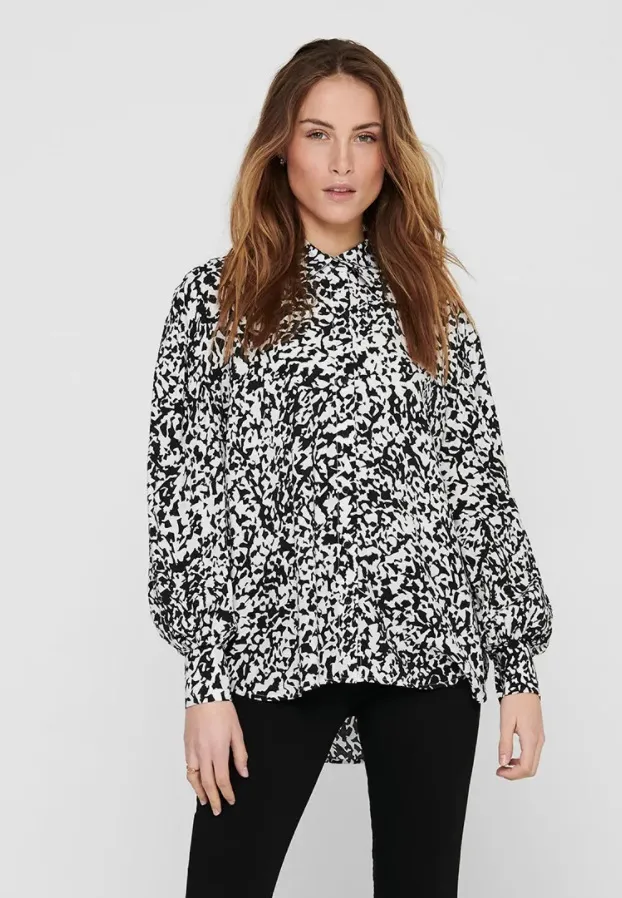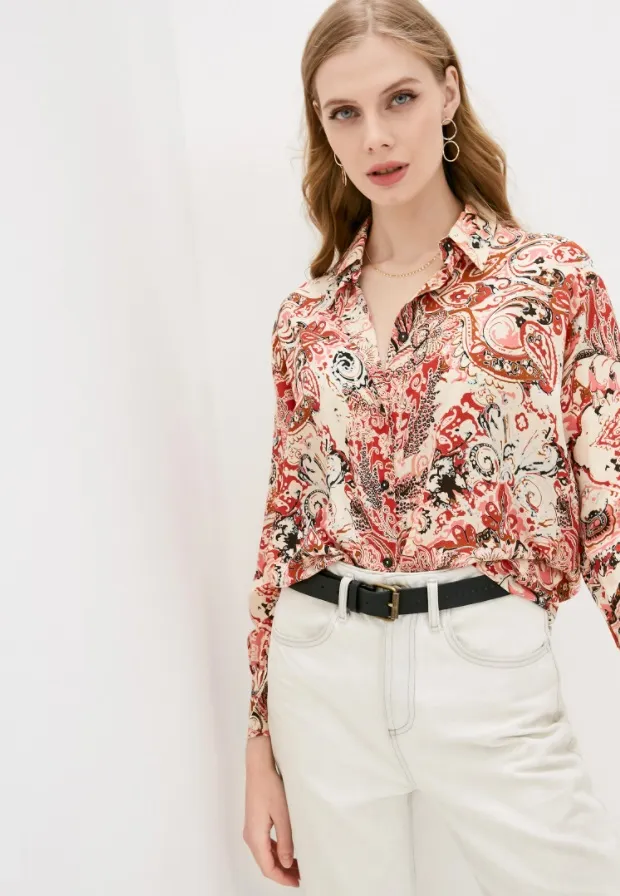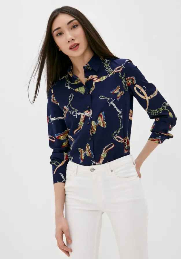 Главный плюс этой блузы в том, что рисунок выполнен в идеально сочетающихся между собой цветах. Поэтому ее можно носить не только с однотонными вещами, но и с принтованными.