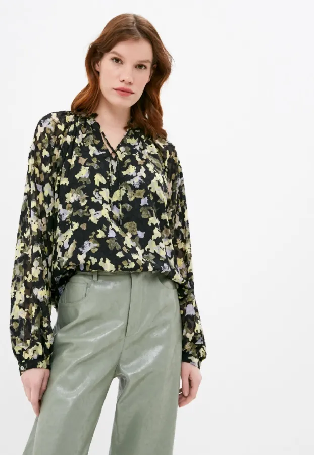 Блуза с абстрактным цветочным принтом будет стильно смотреться с низами зеленого и шалфейного цветов.