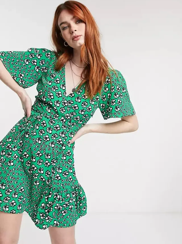 Яркое мини-платье с оборками и цветочными паттернами можно носить в городе с кожаными босоножками на плоском ходу и шляпой канотье, а на пляже — со шлепанцами и однотонными панамами.