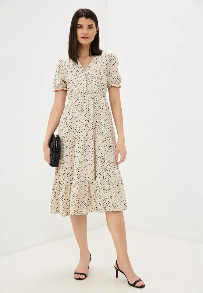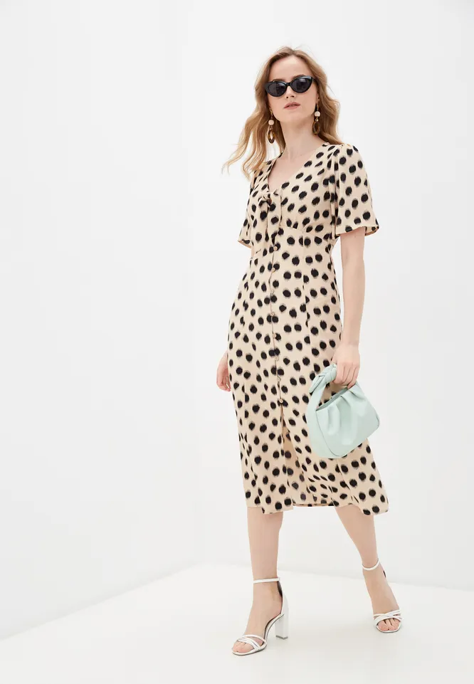 Создать женственный и элегантный образ поможет бежевое платье в крупный горох. Дополни его небольшой сумкой-ридикюлем, очками формы «кошачий глаз» и акцентными серьгами.