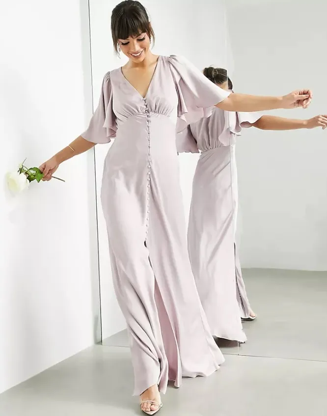 Для вечерних выходов выбирай лоснящееся платье в пол нежно-сиреневого оттенка. В качестве аксессуаров подойдет декорированный ободок, изящные серьги с жемчугом и нейтральная сумочка с нарядной пряжкой.