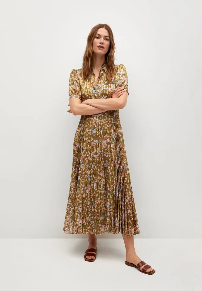 Пестрое платье с плиссированной юбкой — практический готовый наряд для вечеринки или встречи с друзьями. Добавь к нему черные кожаные босоножки и сумку без декора.