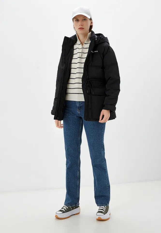 Еще один вариант – черный женский пуховик с капюшоном. Предлагаем дополнить его объемный вязаной шапкой белого цвета и массивной парой обуви – получится стильный, сбалансированный аутфит, в котором можно отправиться на прогулку. Модель выполнена из полиэстера и имеет синтетический утеплитель.