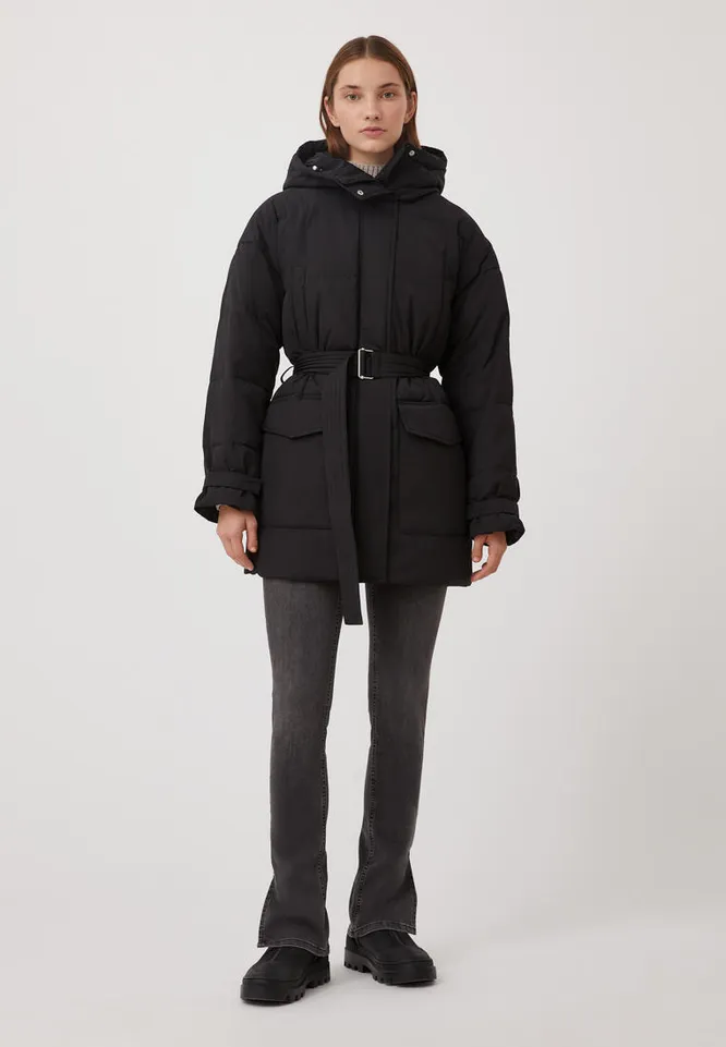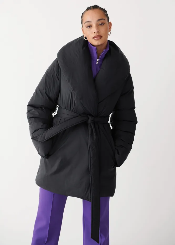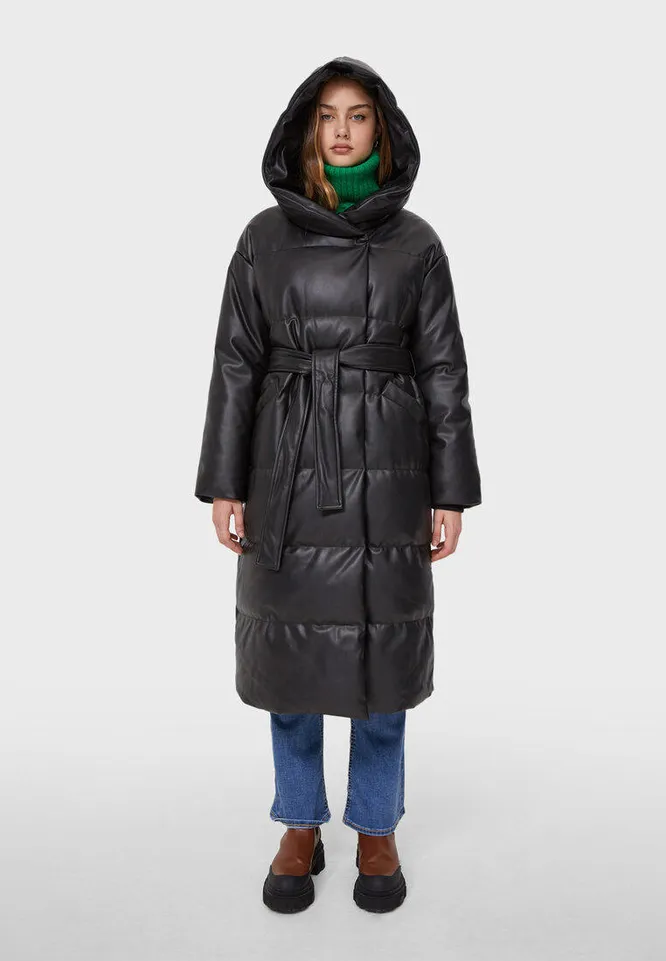 Пуховик с поясом и грубые ботинки