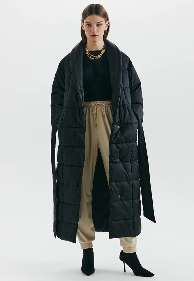 Черное стеганое пальто-пуховик подойдет тем, кто устал от классических пуховиков и шерстяных пальто. Модель одинаково хорошо смотрится и со спортивными трикотажными костюмами, и с женственными платьями, и со строгими брючными костюмами, и с любыми джинсами и свитерами. Что касается обуви и аксессуаров, то к этому пуховику идеально подойдут высокие кожаные сапоги, грубые ботинки, фактурные сумки из кожи, лаконичные вязаные шапка и шарф.