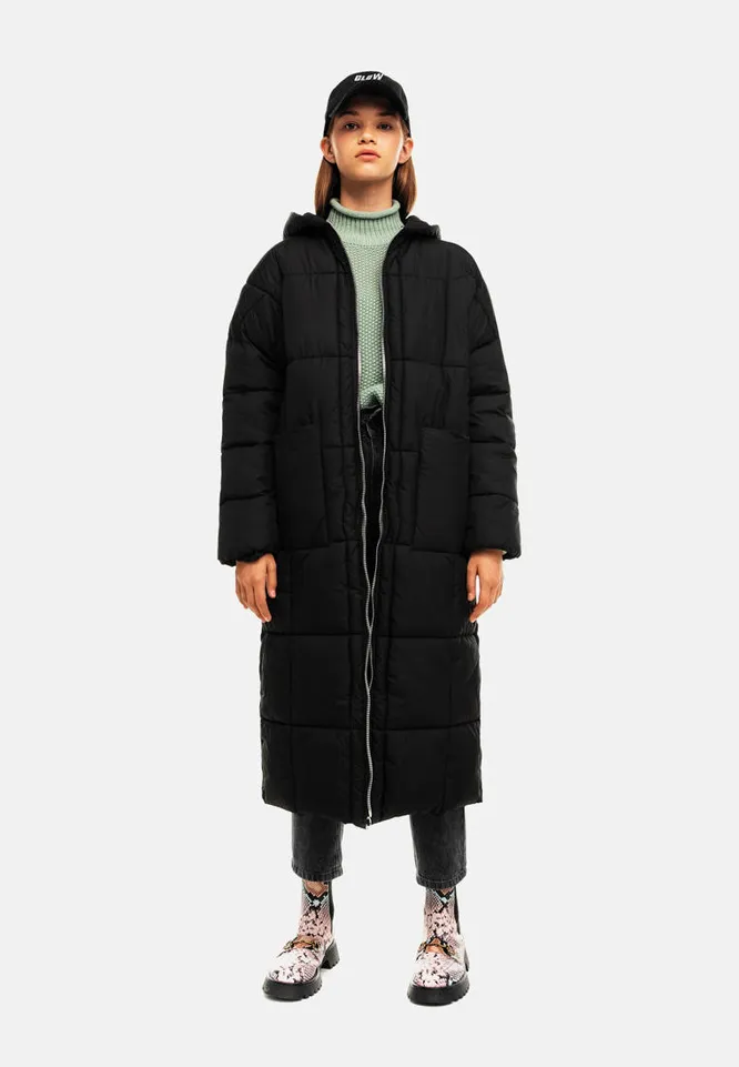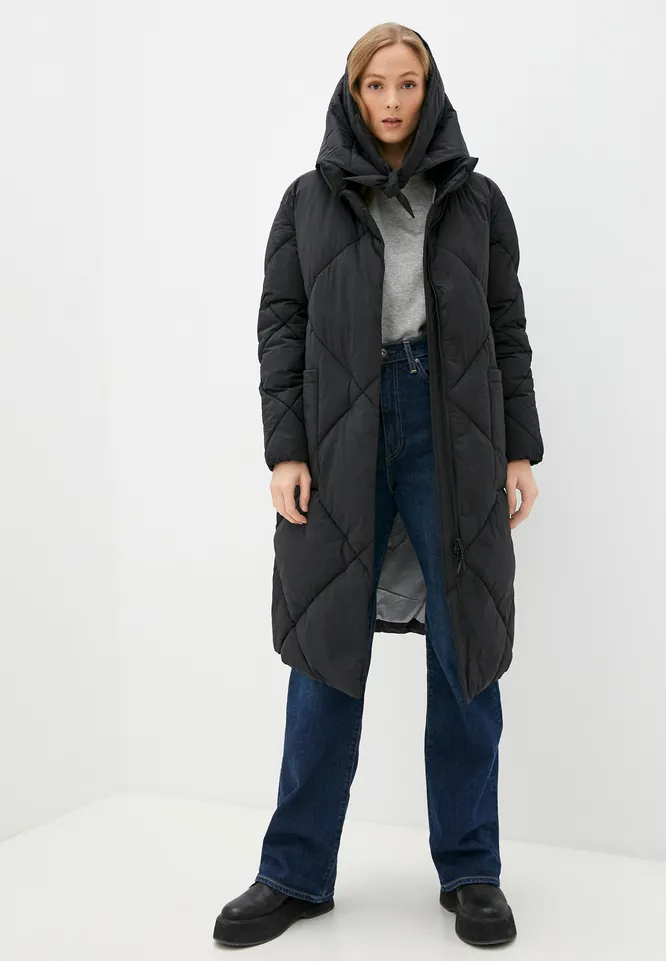 Этот длинный черный зимний пуховик с крупной ромбовидной стежкой выполнен из влаго- и ветрозащитного переработанного нейлона и имеет утеплитель DuPont SORONA Aura, обладающий высокой воздухопроницаемостью. Несмотря на то, что он достаточно легкий, утеплитель долго сохраняет тепло и не теряет форму и объем даже спустя долгое время. В комплекте с пуховиком идет черная съемная косынка.