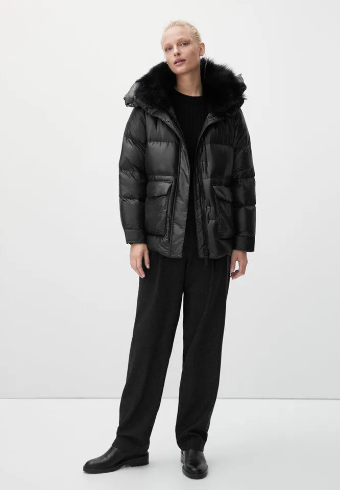 Если ищешь что-то трендовое и теплое, обрати внимание на черный пуховик с мехом. Модель имеет качественный и плотный утеплитель из утиного пуха и пера, так в этой куртке ты точно не замерзнешь. Чтобы создать дерзкий образ, дополняй его кожаными брюками, фактурной сумкой на толстой цепочке и высокими грубыми ботинками на тракторной подошве. Любишь 70-е? Тогда носи его с расклешенными джинсами, ботинками или ботильонами на платформе и длинным узорчатым шарфом.