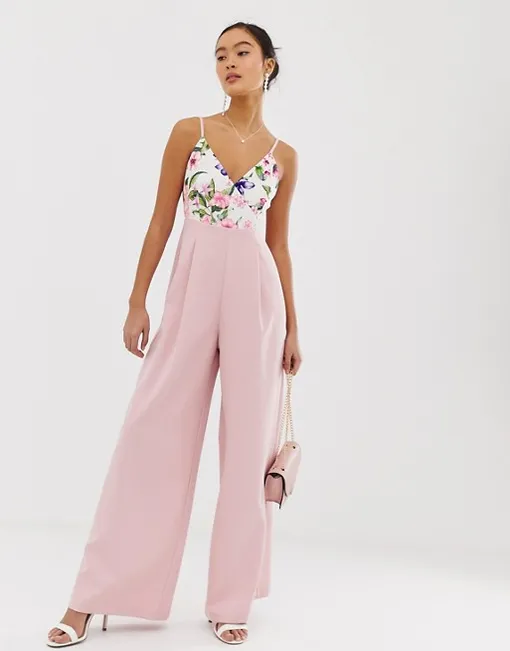 С этим комбинезоном ты сможешь составить нежный, романтический образ — то, что нужно для выпускного бала. Верх выполнен в виде топа на бретелях, декорированного цветочным принтом, низ свободного кроя с высокой посадкой акцентирует внимание на талии, придавая фигуре женственный вид. Сочетай модель с остроносыми лодочками в оттенке нюд и элегантной сумочкой на цепочке.