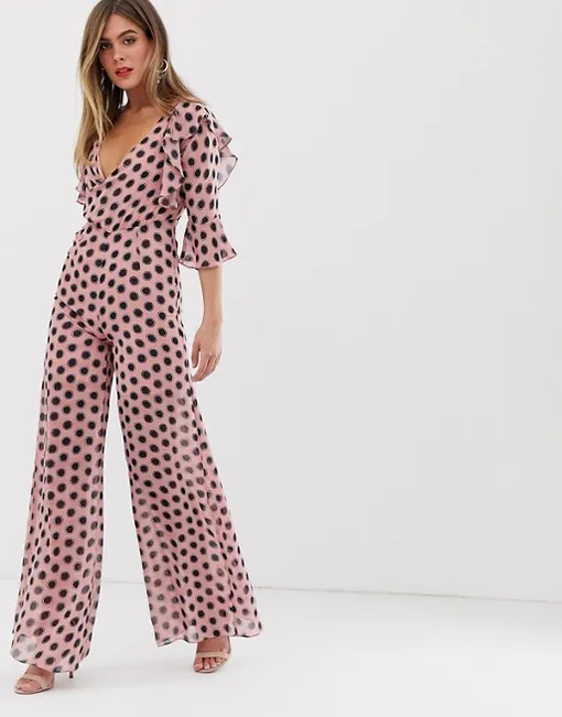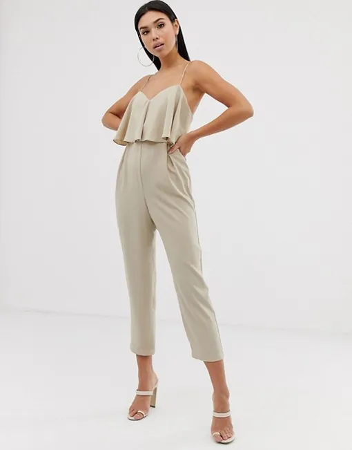 Стильный и лаконичный комбинезон в модном, бежевом оттенке оценят поклонницы классики. Несмотря на то, что модель довольно простая, она не кажется скучной: верх на бретелях декорирован объемными воланами, низ с высокой посадкой подчеркивает талию. Сочетай комбинезон с «лодочками» kitten heels в оттенке нюд и мини-сумочкой на длинной цепочке.