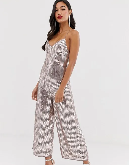 Комбинезон на тонких бретелях, декорированный металлическими пайетками, сделает тебя главной звездой выпускного бала. Надевай его с серебристыми босоножками с тонкими ремешками и маленькой сумочкой на цепочке. Завершат твой образ длинные серьги и яркая помада.
