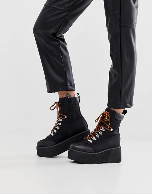 Модные в этом сезоне ботинки на шнуровке дополнены сплошной толстой подошвой, за счет которой ты будешь смотреться выше. Если ты хочешь прибавить несколько сантиметров к росту, не стоит мучить себя каблуками — такая модель ботинок послужит комфортной альтернативой. Носим их с кожаными брюками-бананами и теплой шубой-«чебурашкой» оверсайз-кроя.