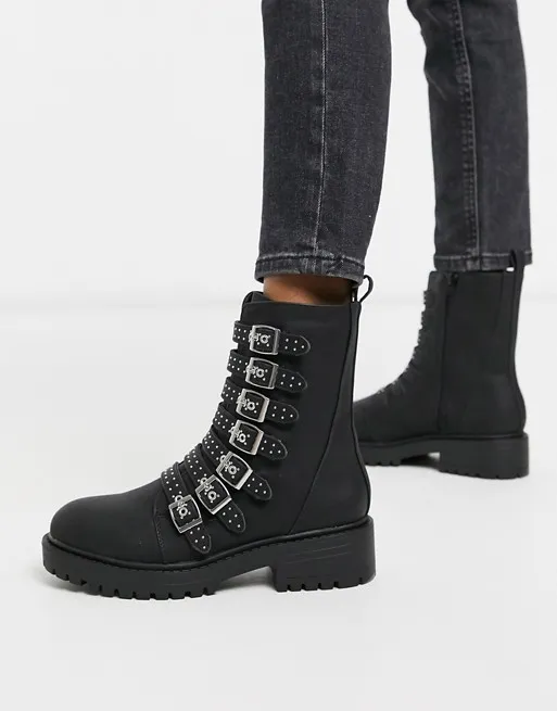 Эти ботинки сделают твой образ острее и интереснее. Модель, декорированная шипованными ремешками, гармонично смотрится с узкими черными джинсами, объемным свитером под горло и дубленкой-авиатором оверсайз. Дополняй наряд в меру объемной вязаной шапкой и рюкзаком, накинутым на одно плечо.