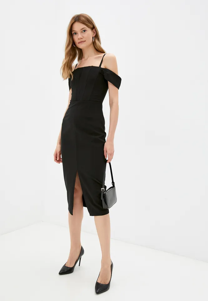 Черное платье-футляр — стильный наряд для новогоднего корпоратива — 2022. Корсетный верх и полуприлегающая юбка этого платья красиво обрамляют фигуру, подчеркивая ее достоинства и сглаживая недостатки. Идеальные дополнения к наряду — классические лодочки, бархатный клатч или небольшая сумка и акцентные серьги. Также можно добавить украшение на шею, чтобы подчеркнуть изящные ключицы.
