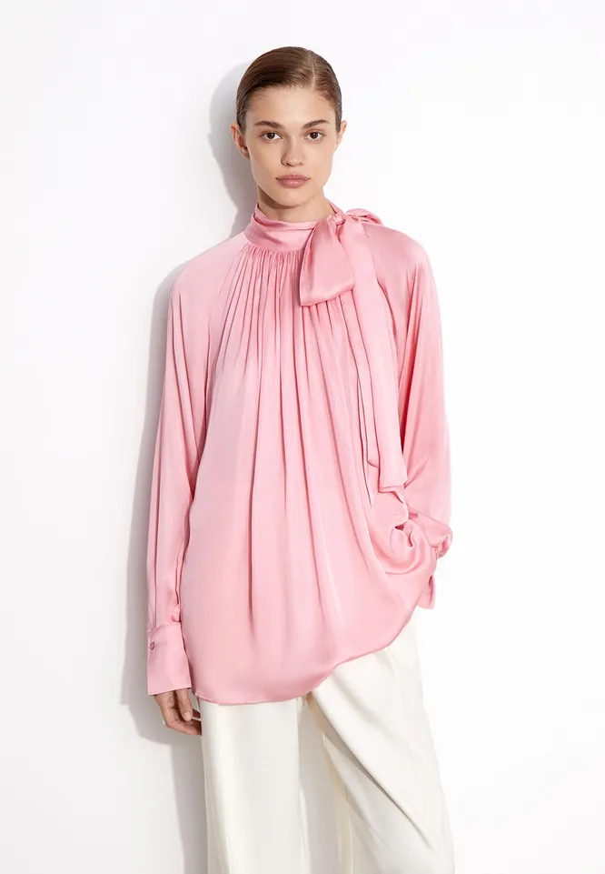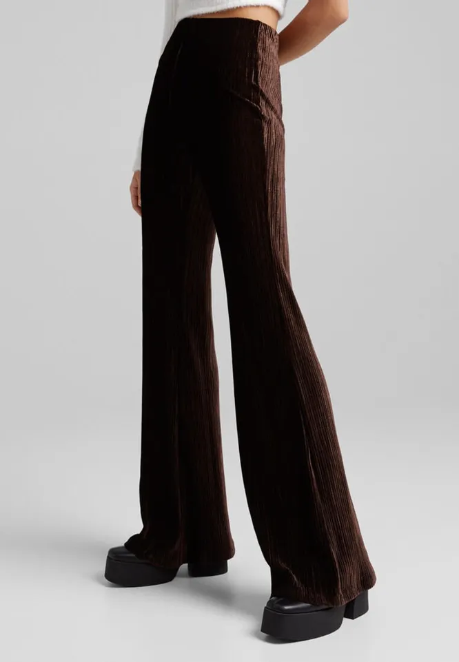 Сдержанный, но в то же время немного богемный новогодний наряд на корпоратив с брюками клеш из фактурной вельветовой ткани. Романтичная струящаяся блуза с ниспадающим бантом придает шик и нарядность. Из аксессуаров выбирай сумочку в пайетках или сатиновый клатч, элегантные туфли или остроносые ботильоны на каблуке. Такой наряд уместен и в офисе, и в ресторане, и в ночном клубе.