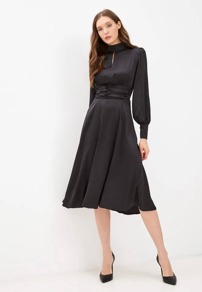 Черное платье миди из шелковистой ткани с акцентом на талии – отличный вариант наряда на новогодний корпоратив для женщин 40+ лет. Оно в меру элегантное, нарядное и женственное. Если хочешь сделать образ менее сдержанным, надевай нарядную обувь (например, туфли с глиттером) и добавляй акцентные аксессуары. После корпоратива это платье ты сможешь надеть на любую другую вечеринку, романтическое свидание, в музей или театр.
