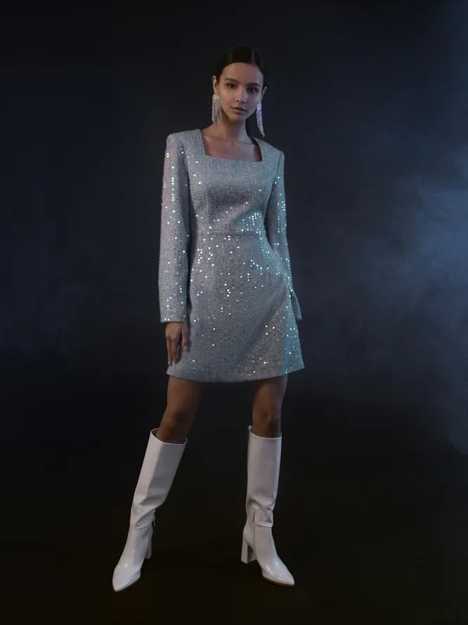 Коктейльное мини-платье классического кроя, украшенное пайетками, хороший выбор для корпоратива в честь Нового года 2022 (фото). Дополняй его белыми, черными или серебристыми сапогами или лодочками, бархатной сумкой и парой мерцающих заколок для волос.