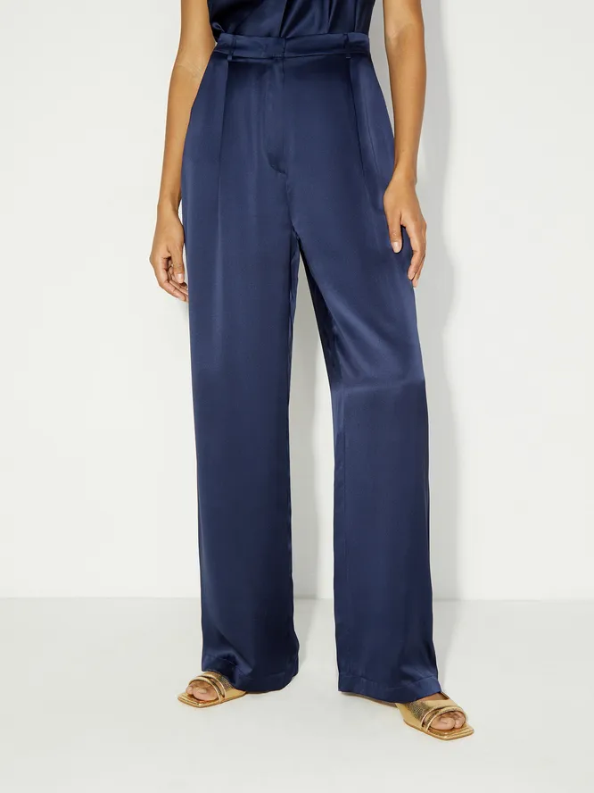 Ультрамодный и интересный новогодний наряд для женщин на корпоратив-2022 – темно-синий костюм с блузой и струящимися брюками из натурального лоснящегося шелка. В качестве аксессуаров выбирай акцентные кольца, длинные серьги в стразах и нарядный аксессуар для волос (ряд блестящих заколок или декорированный ободок). Из обуви подойдут и лодочки, и босоножки на шпильке, и ботильоны на каблуке. Заверши наряд бархатной сумочкой на цепочке.