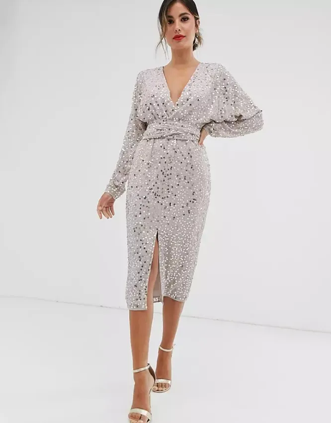 Если ищешь что-то блестящее, советуем купить в качестве стильного наряда на новогодний корпоратив — 2022 платье на запах, расшитое пайетками. V-образный вырез визуально удлиняет шею, пояс подчеркивает талию, а завышенная посадка зрительно удлиняет ноги. К этому платью не требуется много аксессуаров, можно ограничиться изящными сережками, аккуратным кулоном на тонкой цепочке и сатиновым клатчем.