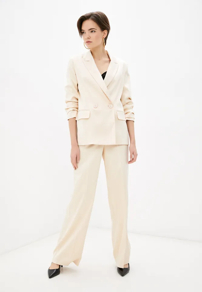 Беспроигрышный наряд на новогодний корпоратив для женщины – брючный костюм. Мы выбрали комплект кремового цвета с двубортным блейзером и широкими брюками с высокой посадкой. Как базу используй топ в пайетках или топ-бюстье. Вечерним и нарядным этот образ сделает декорированная сумка или клатч, крупные серьги и украшение для волос. Главный плюс этого варианта – ты сможешь носить этот костюм и после праздников в повседневной жизни.