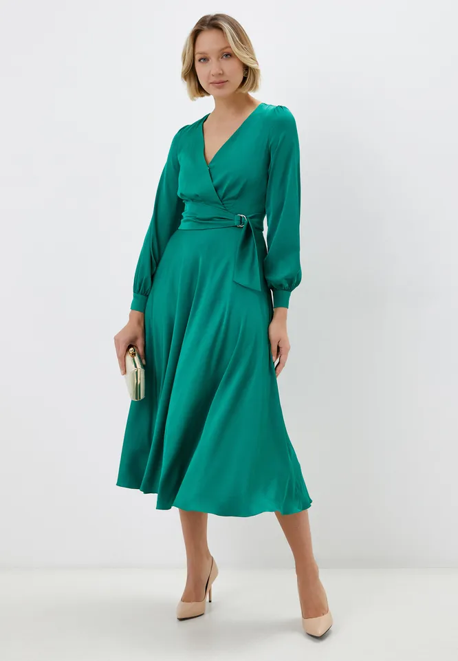 Если ищешь что-то одновременно простое и праздничное, предлагаем в качестве наряда на корпоратив купить платье миди на запах красивого зеленого цвета. Фасон выгодно подчеркивает фигуру, скрывая мелкие недостатки. Отличным дополнением к платью станет многослойное колье, нарядные серьги и блестящий клатч. Из обуви выбирай серебристые ботильоны или сапоги, закрытые туфли или вечерние босоножки.