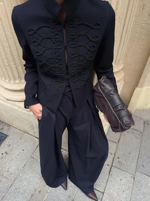 Но на самом деле речь идет о стилизации под военные жакеты той эпохи, которую в модных кругах прозвали «наполеоном». Высокие воротники-стойки, выразительные плечи, приталенный силуэт и, конечно, акцентные ряды пуговиц и застежки-петли — вот что в первую очередь определяет такой фасон.